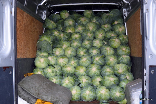 A truck full of large cabbages.