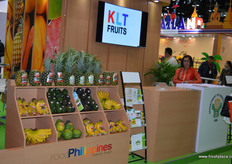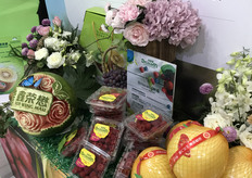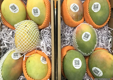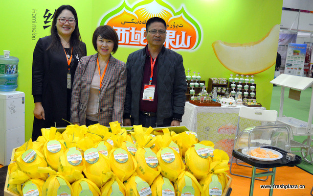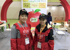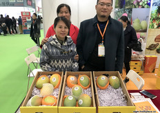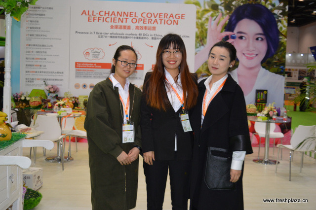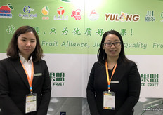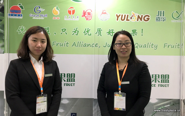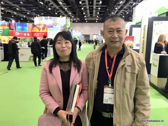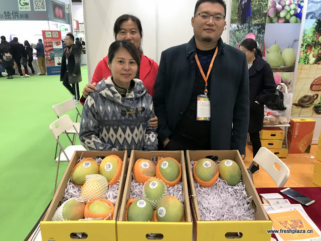 Tina Y.L. Yeung, CEO at Hong Kong Golden Sunflower, an import company, is visiting her panzihua mango suppliers at the stand of MeiGuoBao. To the right is Bai Bing, General Manager.