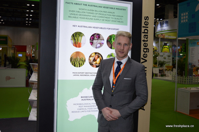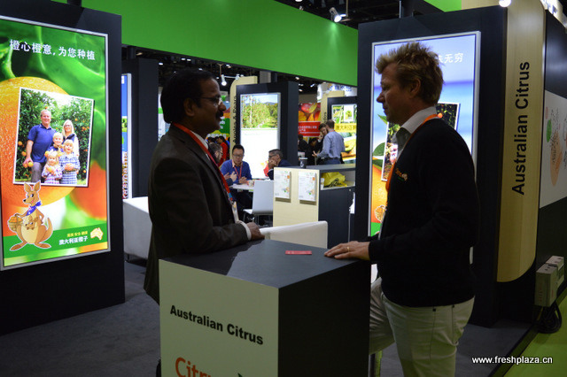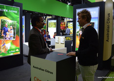 Meetings at the stand of Australian Citrus. To the right, David Daniels. This year was a record year for Australian citrus exports to China with a total volume of over 50,000 tons.