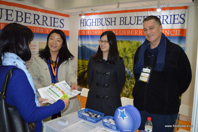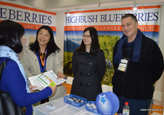 Julia Zhu, Mandy Chen and Thomas Payna are receiving interest from visitors at the stand of the US Highbush Blueberry Council.
