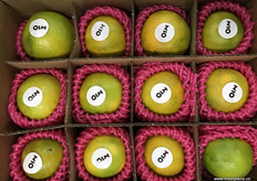 Special Hainan citrus variety with a green skin and orange flesh by KIO, the Hainan KIO Fruit Company. Hainan is a tropical island in Southern China and a large producer of fruits.