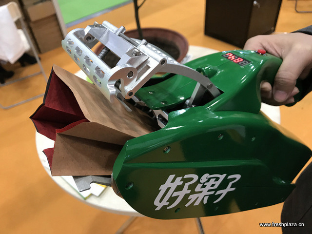 Bagging machine that can be used to bag individual fruits still on the tree, designed and made by Chinese company Fruits de Bonheur.