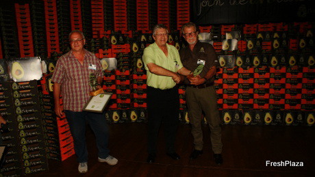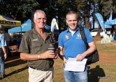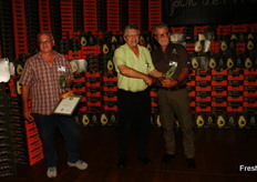 Oren Wallach (left) and Graham Anderson (right), two nurserymen, receive the Maulma Pioneer award from Dr André Ernst of Allesbeste Boerdery.