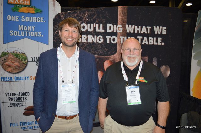 Hunter Gibbs and Don Sparks of Nash Produce talk to show attendees about their selection of sweet potatoes.
