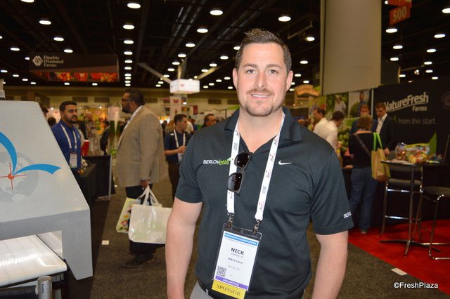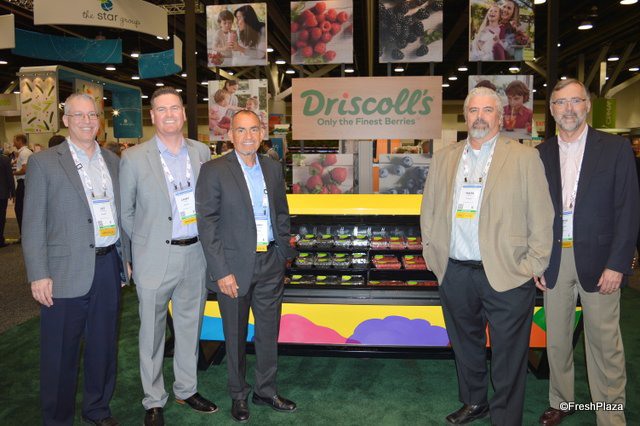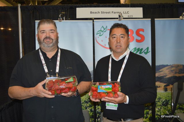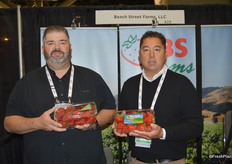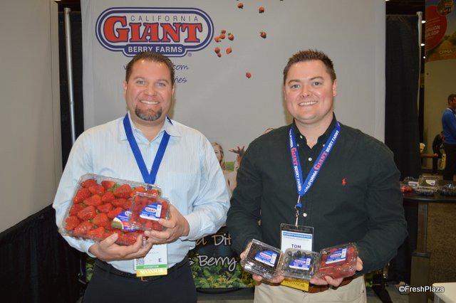 Nick Chappell and Tom Smith with California Giant Berry Farms have a variety of berry products on display. Nick shows a 4 lb. clamshell of strawberries for club stores and foodservice. California Giant will be significantly expanding its raspberry production. Starting in the fall of this year and into 2019, the company's Mexican raspberry production will increase tenfold.