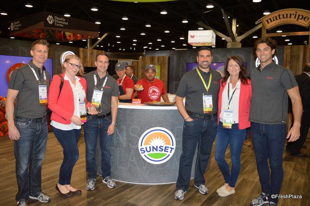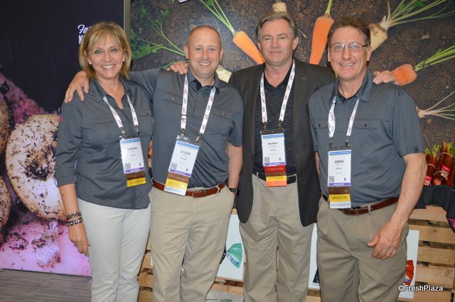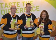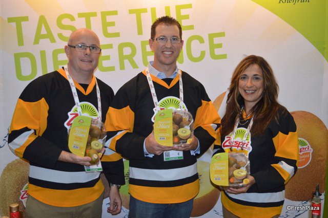 The Zespri team is promoting SunGold kiwi fruit. The fruit is on the water on its way from New Zealand to North America. Within three weeks, retailers in the US and Canada should have good supplies in stores. Last year, SunGold consumption grew 25% in Canada and 36% for all of North America. Glen Arrowsmith, Ben Hughes and Debbie Rogers show topseal clamshells with 2lb. SunGold kiwifruit.