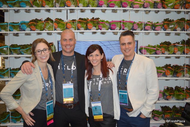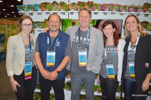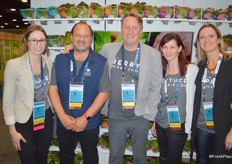 The team of Star Produce in front of a wall of living lettuce called Inspired Greens. The company recently announced its plans to expand production from 11 million to 20 million heads per year. From left to right: Jessica Wells, Ernesto Maldonado, David Karwacki, Rindi Bristol and Devon Kennedy.