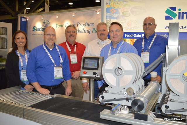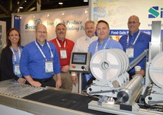 Maria Montalvo, Scott Howarth, David Ramynke, Mark Reed, Chris Faxon and Brandon Hobson with Sinclair. The company features its compact pattern tray labeler.
