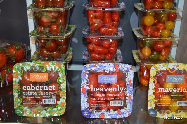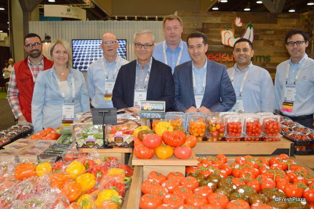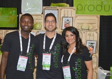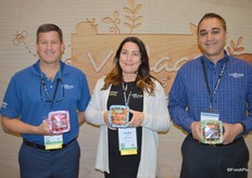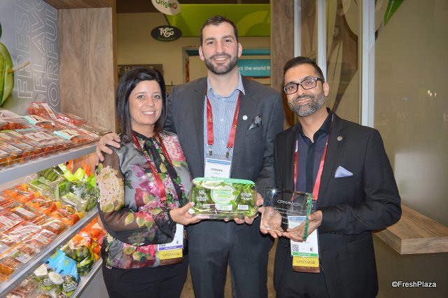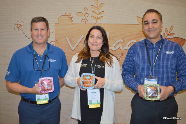 The Village Farms team proudly shows its Stackable Snackables. Stackable top-seal containers that allow the retailer to place more containers in the same shelf space. From left to right: Steve Poklemba, Helen Aquino and Aman Chatha.