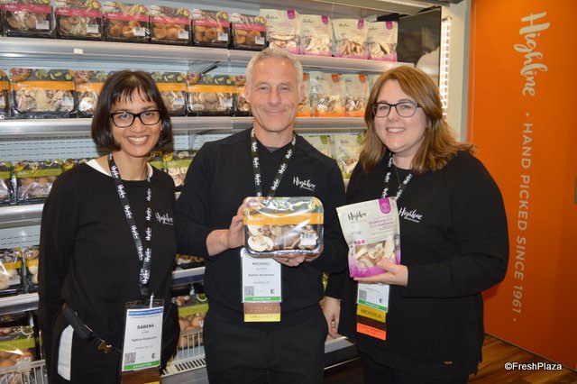 Sabena Khan, Michael Rotter and Jane Rhyno with Highline Mushrooms. Michael proudly shows a top seal package and Jane shows mushrooms in a bag. The bags are all recyclable and work very well to merchandise blends of mushrooms.