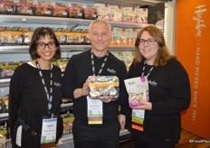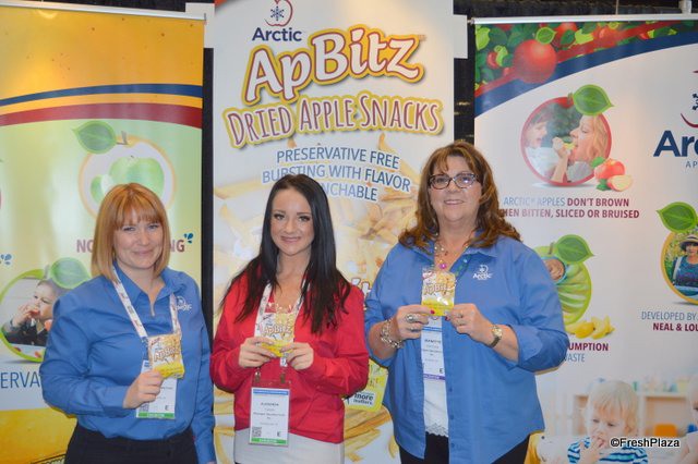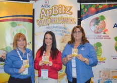 Jessica Brady, Alexandra Turner and Jeanette De- Coninck-Hertzler with Okanagan Specialty Fruits proudly show Arctic ApBitz dried apple snacks. Alexandra just started with the company.