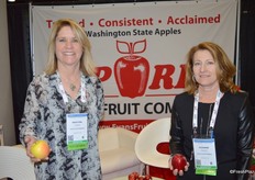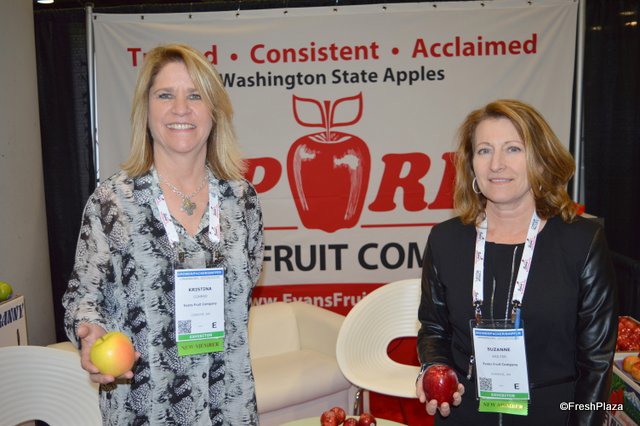 Kristina Conrad and Suzanne Wolter with Evans Fruit Company are holding a Golden Delicious and Gala apple.