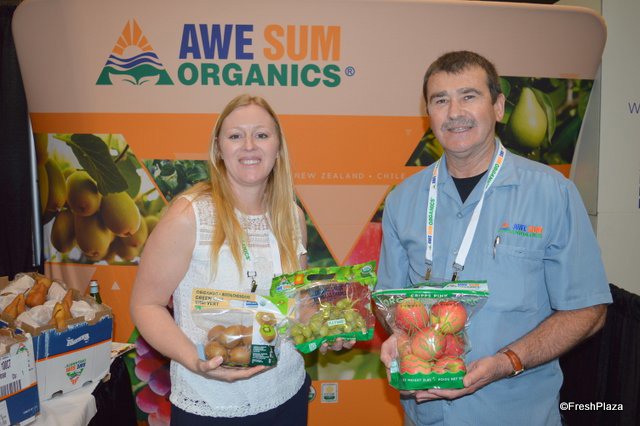 The Awe Sum Organics team shows different pouch bags with organic fruit. Jodi Carkner is holding organic kiwi fruit and grapes while Kirk Crane shows organic apples.