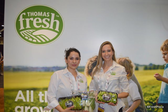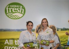 Carolina Chevalier and Andrea Dubak with Thomas Fresh proudly show specialty produce items in the company's new compostable, recyclable trays.