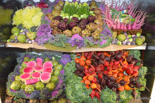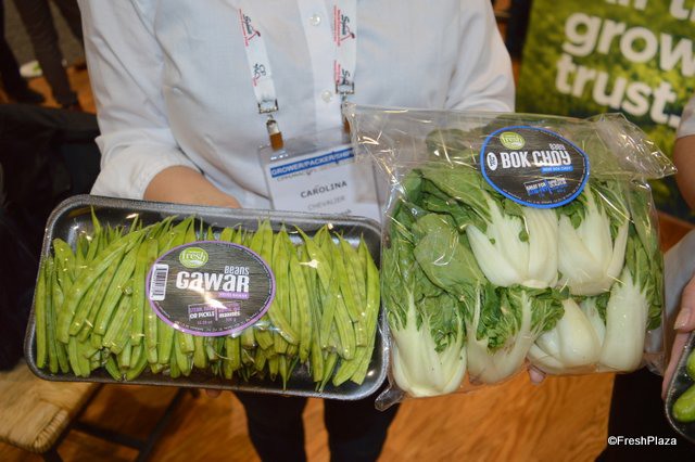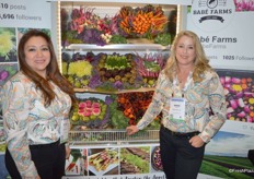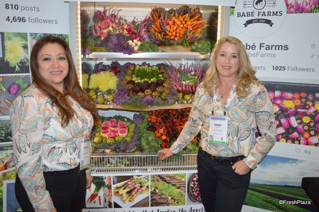Rocio Munoz and Ande Manos with Babe Farms stand in front of a colorful display of specialty vegetable items.