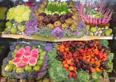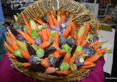 Beautiful display of different colors of carrots and Brussels sprouts from Babe Farms.