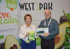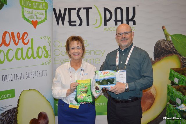 Christine Connell and Scott Ross with West Pak Avocado are featuring California avocados at the CPMA show. Christine shows Avo Monsters while Scott shows the I Love Avocado bags.