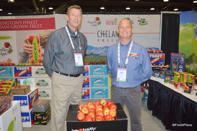 Tim Evans and Mac Riggan stond in front of a bin with Koru apples from New Zealand. In total, about 120 containers of Koru apples will be shipped to the US to be distributed from coast to coast.