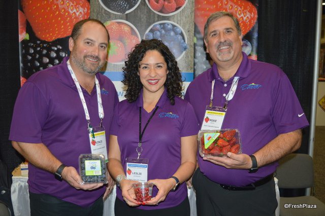 Vince Ferrante, Leslie Simmons and Mike Bowe with Dave's Specialty Imports show Florida blueberries, pomegranate arils as well as California-grown strawberies.