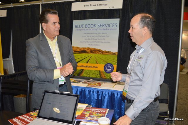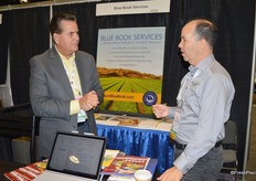 Frank Sanchez with Blue Book Services is talking with Luis Camejo of Gwillimdale Farms from Bradford, Ontario.