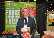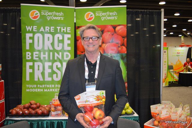 Dan Harrington with Domex Superfresh Growers proudly shows a pouch bag with Autumn Glory apples.