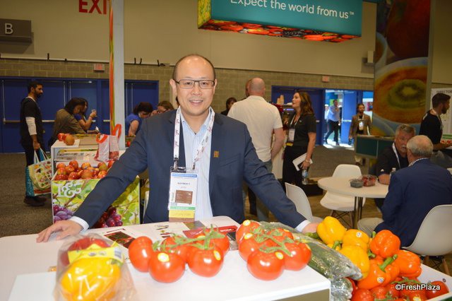 Raymond Wong of OriginO proudly shows organic tomatoes, bell peppers and cucumbers. OriginO's products are distributed by Oppy.