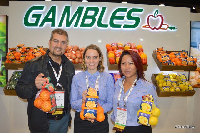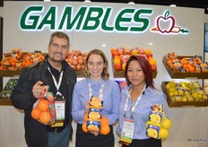 From left to right Tom Kioussis, Sarah Taylor and Rochelle Payawal with Gambles. The company imports citrus from many different origins.