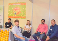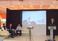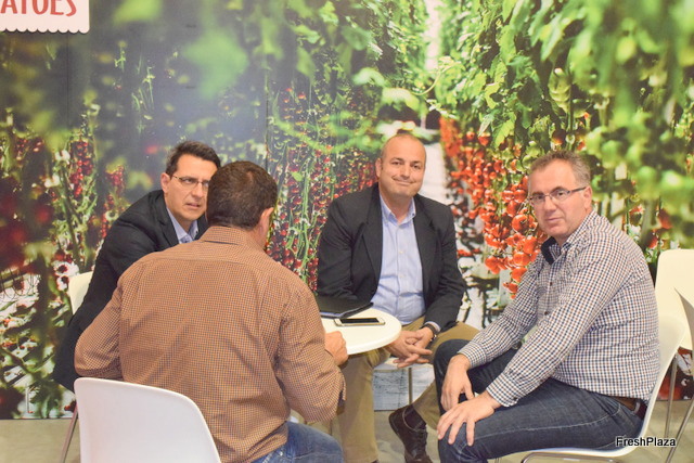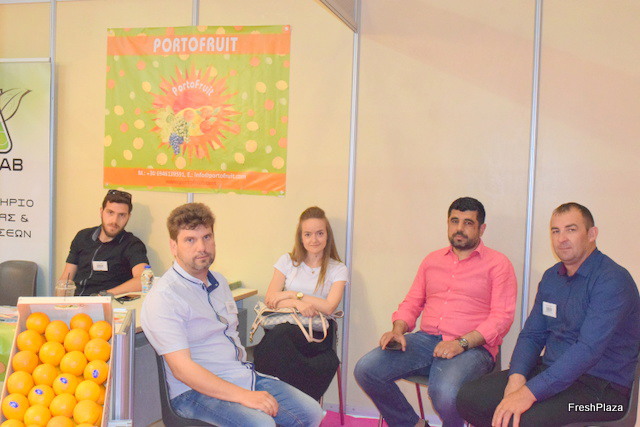 Panagiotes Portoulvas (second from left) from Portofruit, speaking with customers at the stand.