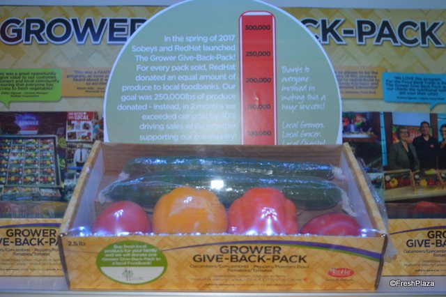 The Grower Give-Back-Pack is a fresh, local multi-pack featuring undersized product. It contains 2 short cucumbers, 2 45 count tomatoes and 2 medium peppers. For every case sold in Western Canadian Sobeys stores last summer, 1 case was donated to local area Food Banks.