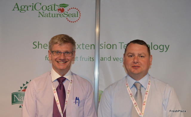 Simon Matthews and Robert Round from AgriCoat had new edible coating which can be used to preserve whole fruits and vegetables.