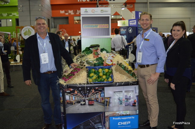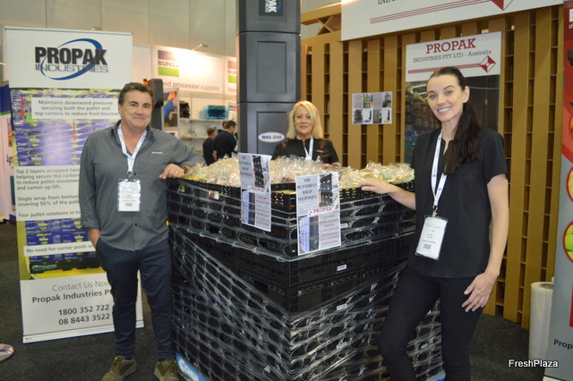 Garry and Cheryl Sandercock and Leonie Butcher at Propak with a new Buttefly pallet wrap.