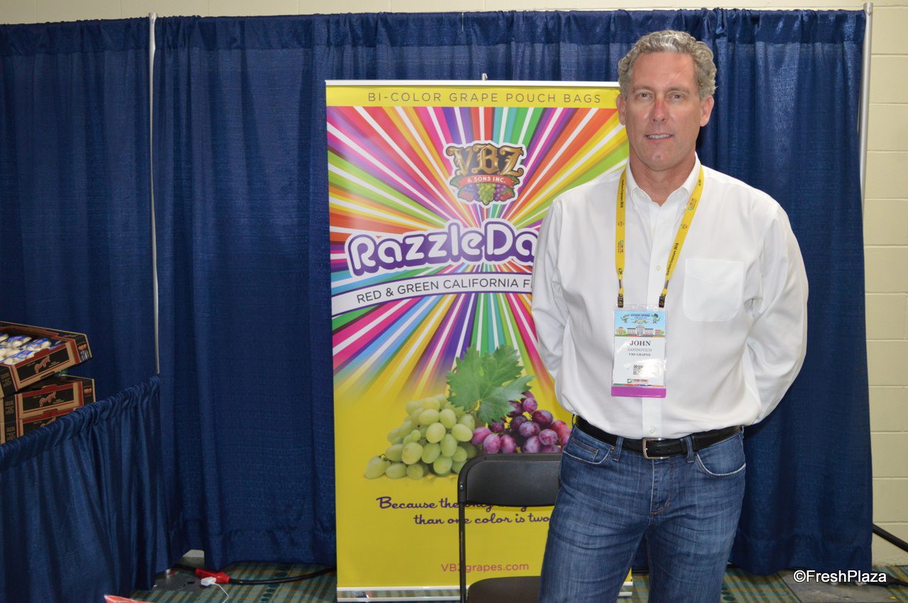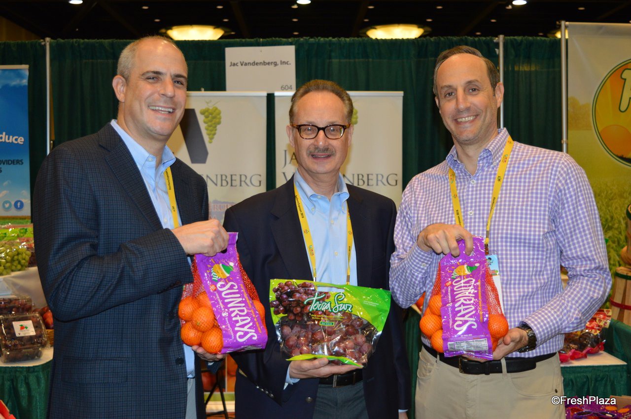 Fred Vandenberg shows Terra Sur grapes from Peru. He is flanked by Michael Schiro and Brian Schiro who both show Sunray mandarins.