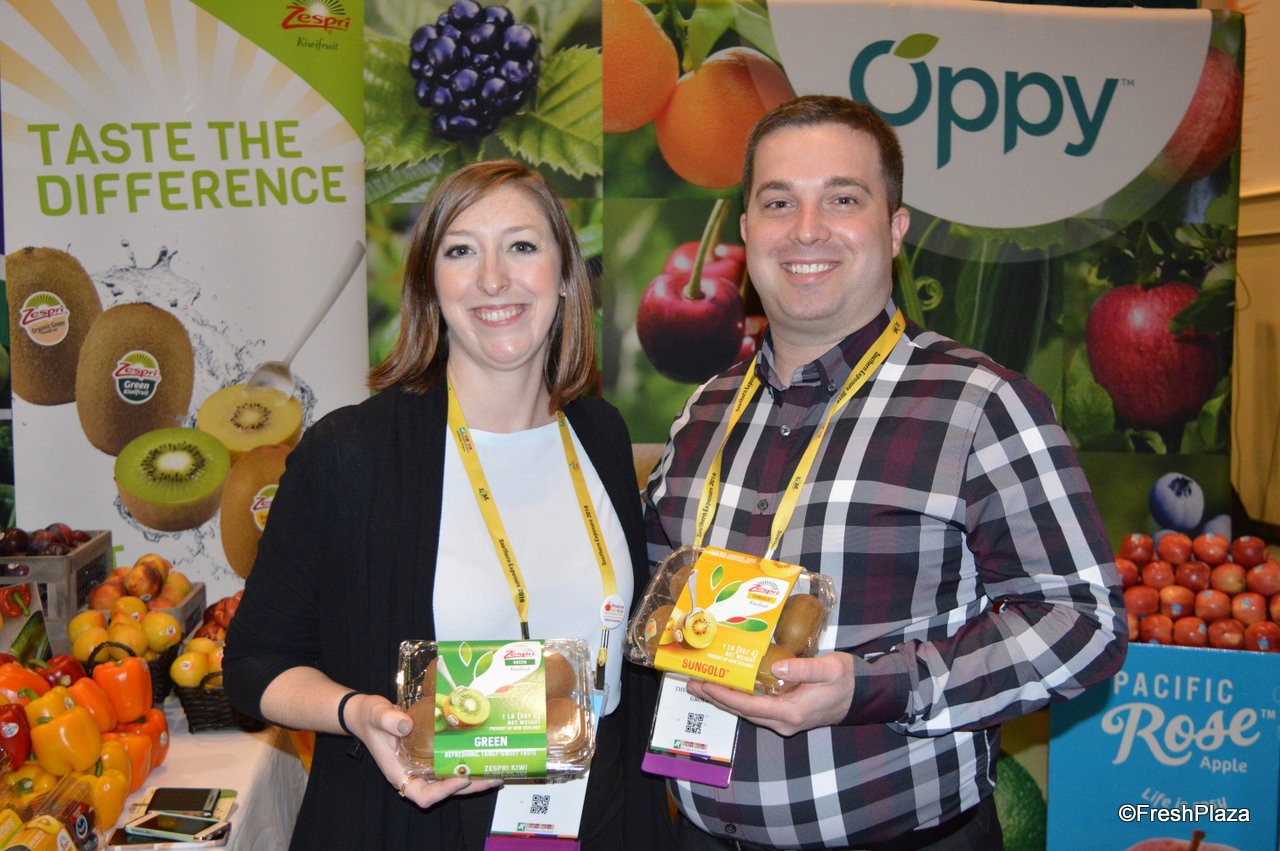 Caitlin Klueber and TJ Wilson with Oppy are showing new packaging for Zespri's green and Sungold kiwis.