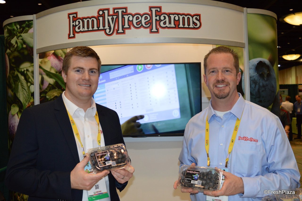 Brenton Helm and Doug LaCroix with Family Tree Farms show clamshells with blueberries from Mexico.