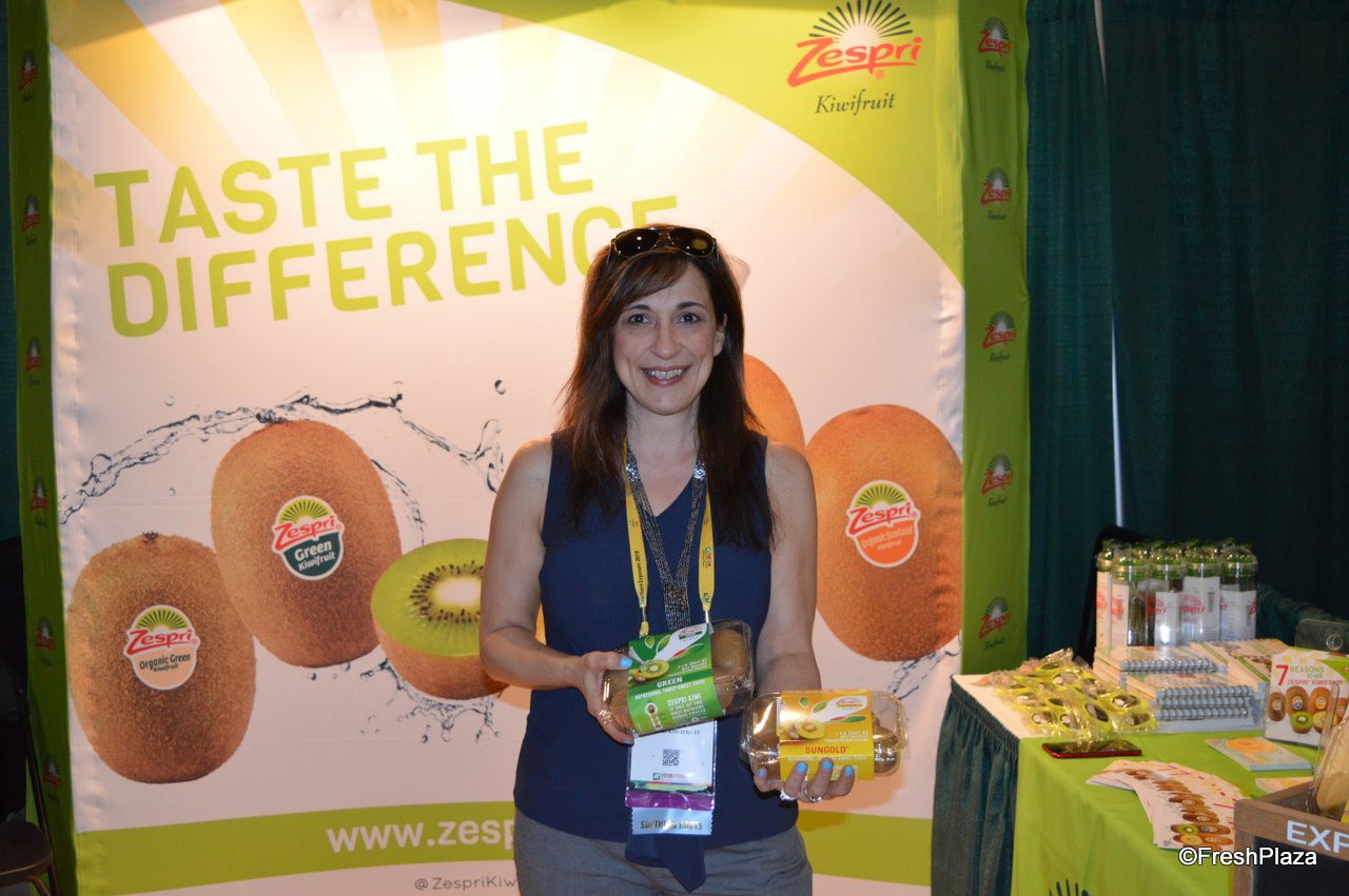 Debbie Rogers with Zespri proudly shows the company's new packaging for Green and Sungold kiwifruit. The new packaging will be launched in the US when the New Zealand kiwifruit season starts in May.