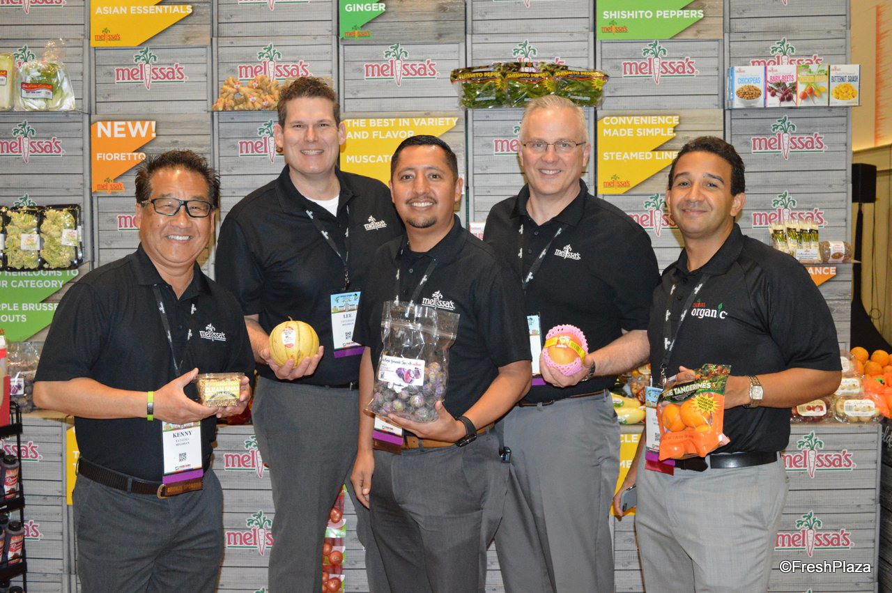 The team from Melissa's, showing a variety of specialty items. Ranging from CleanSnax to a Charentais melon from the Dominican Republic to purple Brussels sprouts, a tree-ripened Haden mango from Mexico and Ojai Pixie tangerines.