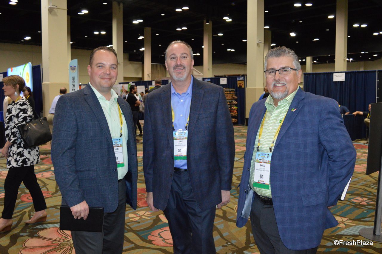 Walking the floor are Kraig Loomis and Dan Acevedo with GreenFruit Avocados. In the middle Jeff Kelly with Veg-Fresh Farms.
