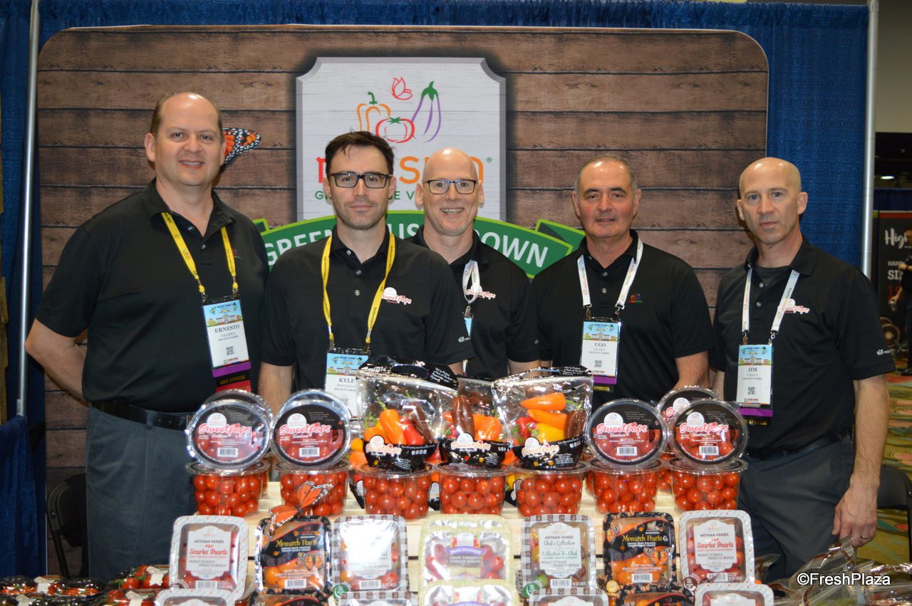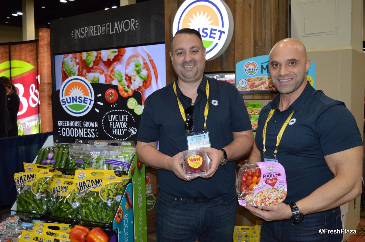 Ray Wowryk and Matt Quiring with NatureFresh Farms show mini sweet peppers as well as Tomz in topseal packaging.