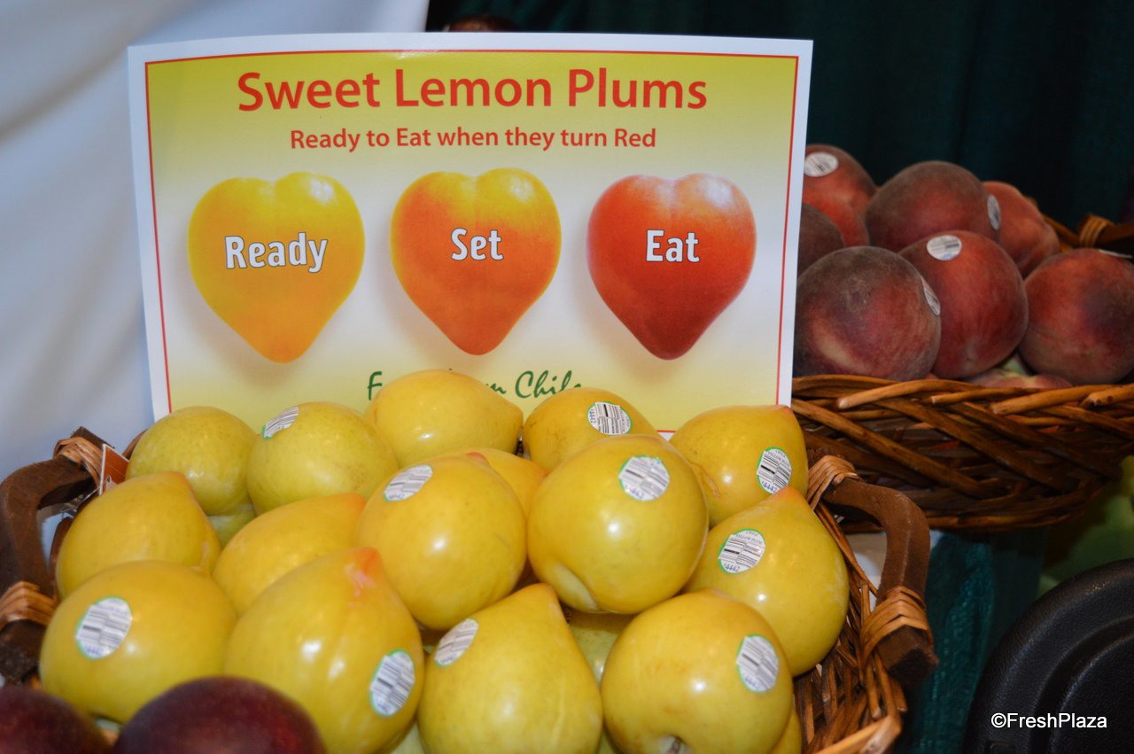 Sweet lemon plums from Chile on display at Jac. Vandenberg, Inc. Customers buy these sweet plums when yellow, but they are ready-to-eat once they've turned red.