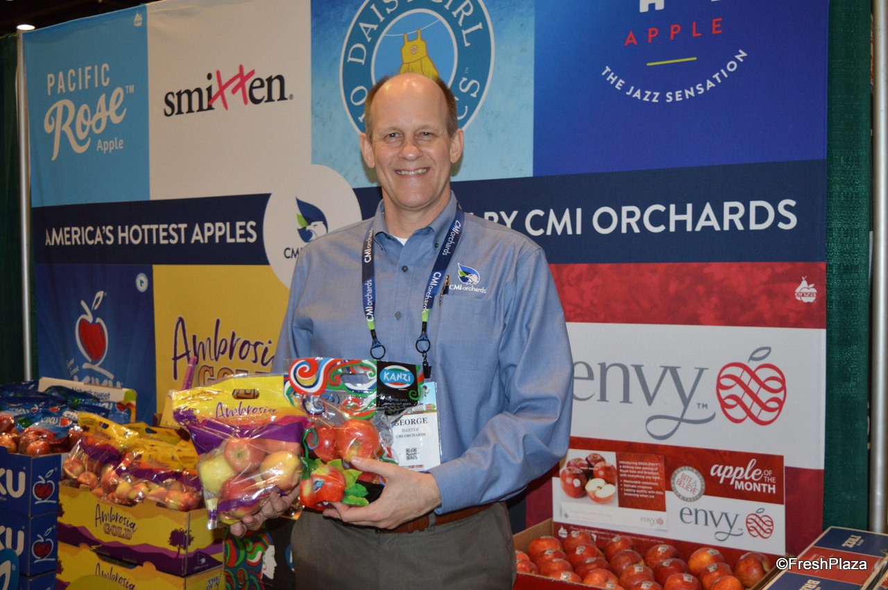 George Harter with CMI proudly shows pouch bags with Ambrosia and Kanzi apples.