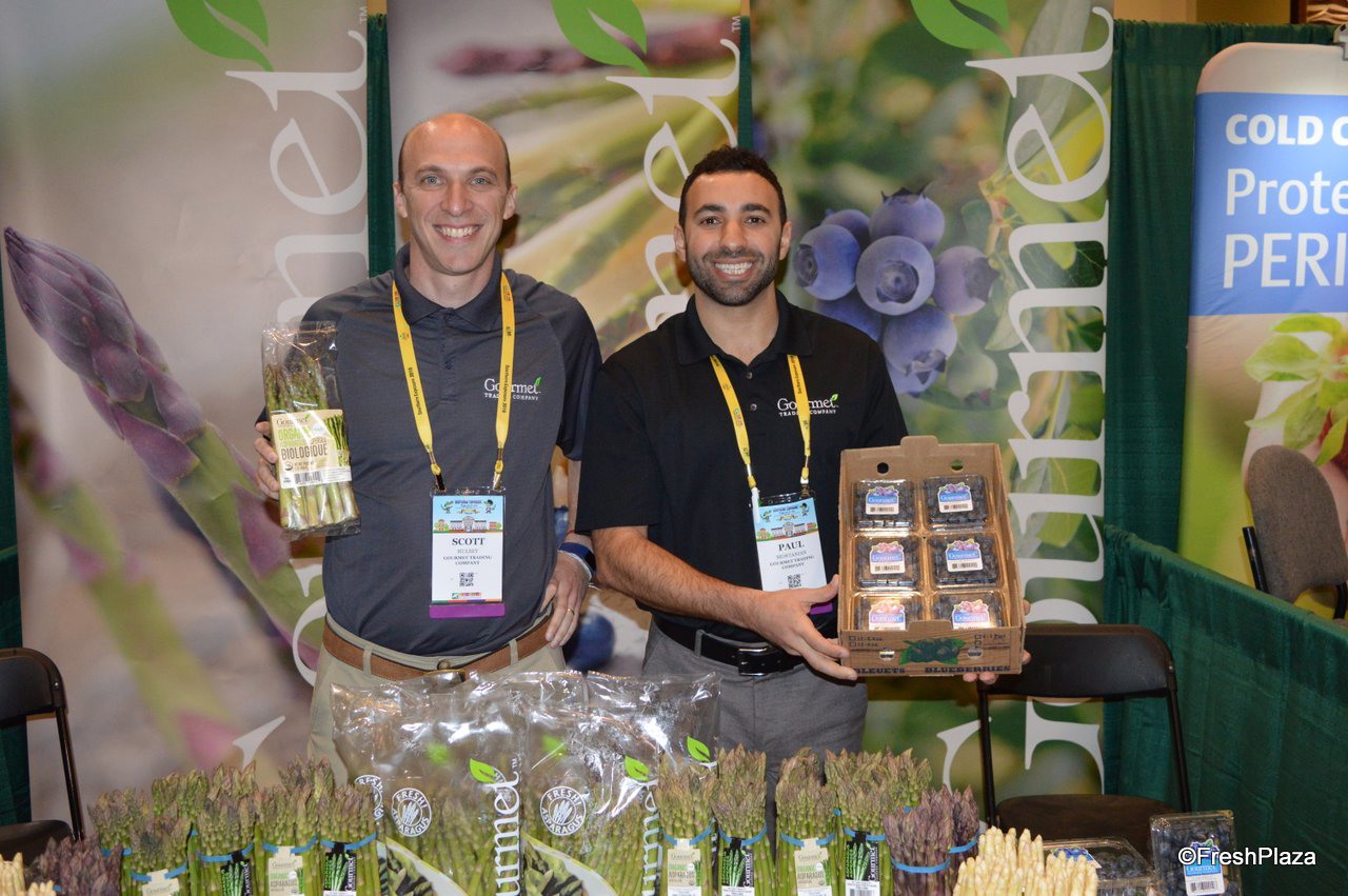 Scott Hulsey and Paul Mortanian with Gourmet Trading Company show asparagus and blueberries. The company is ready to switch to its domestic blueberry season.