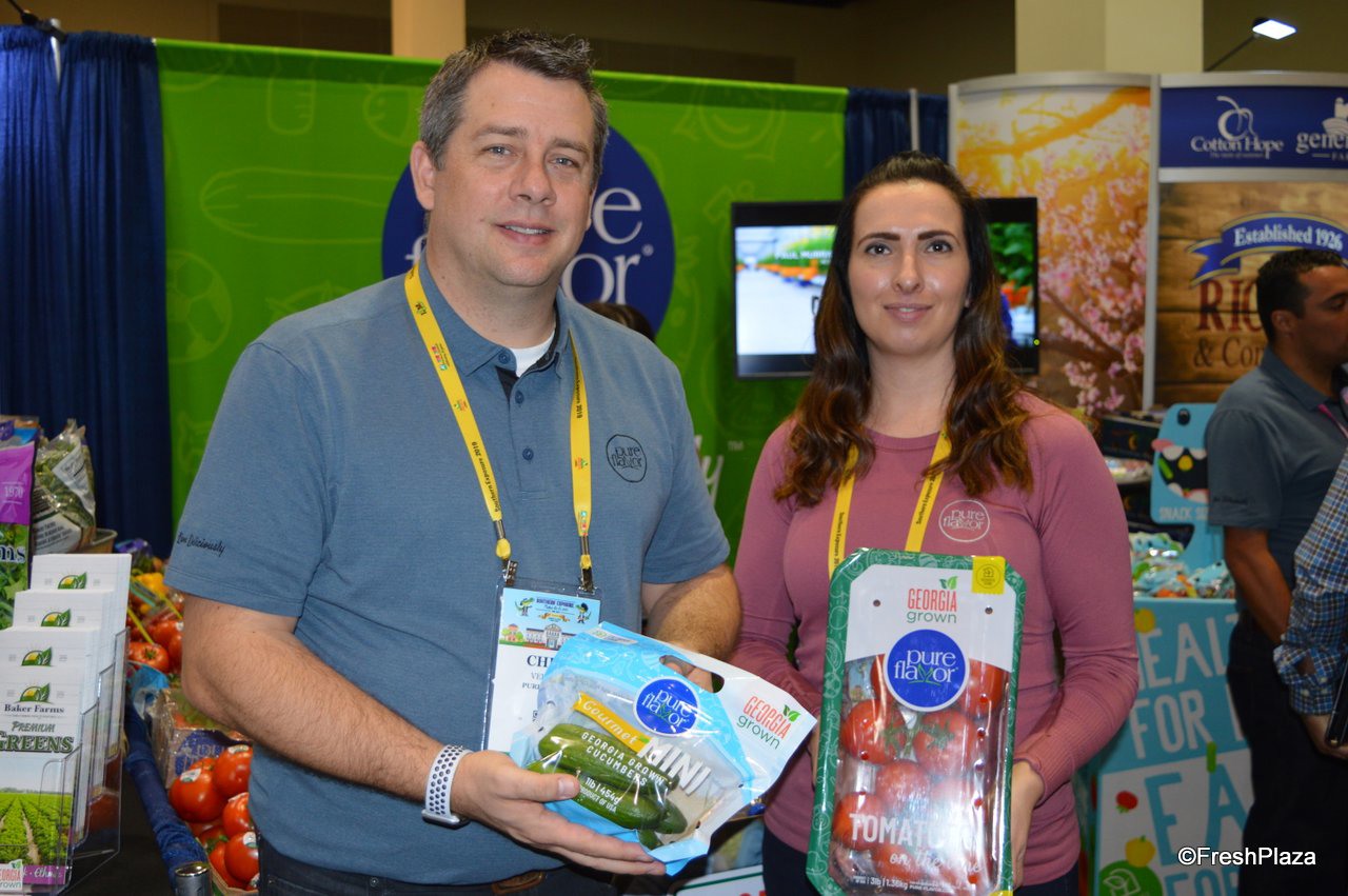 Chris Veillon with Pure Flavor and his colleague proudly show mini cucumbers as well as tomatoes from the company's greenhouse in Georgia.