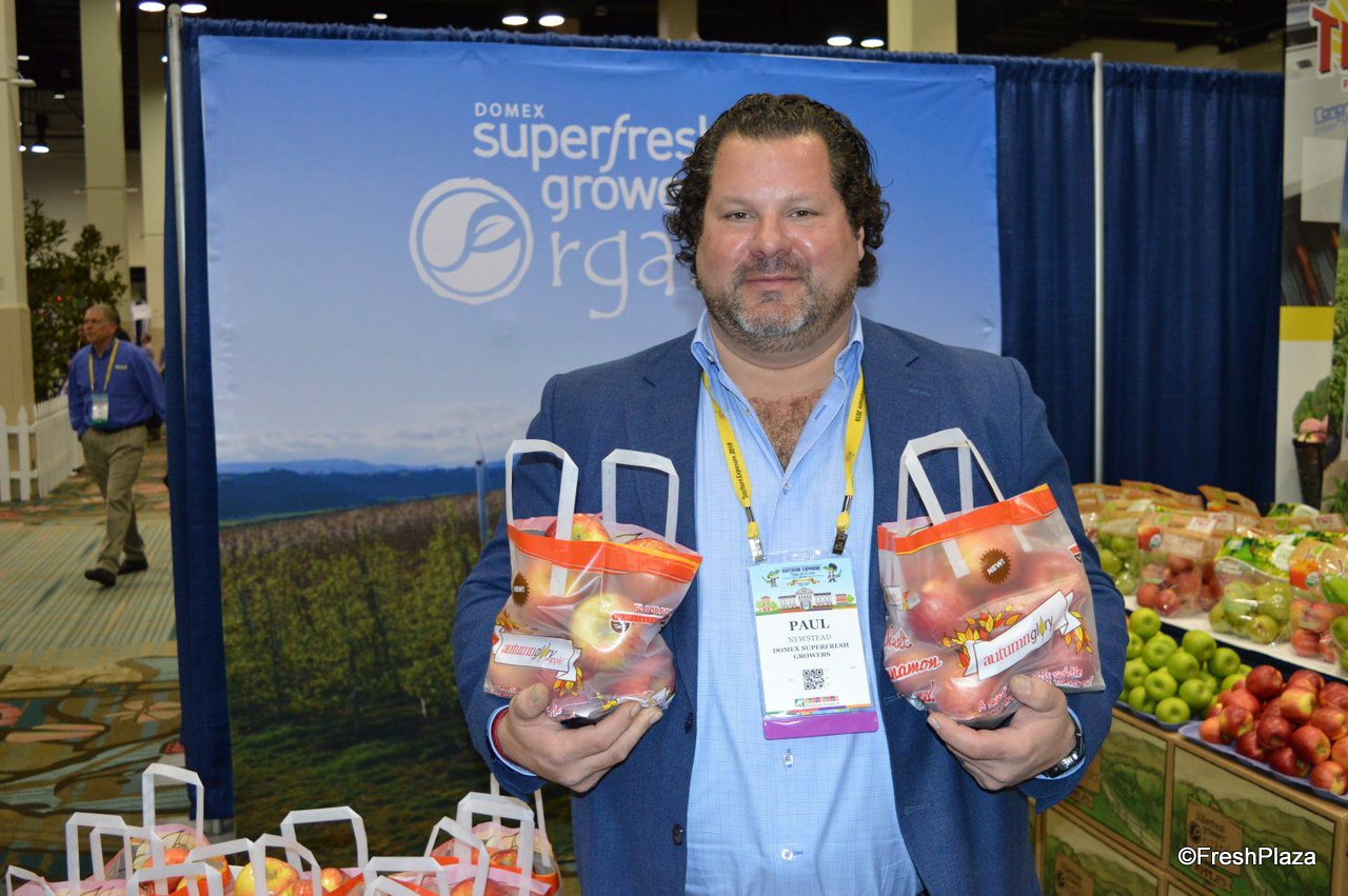 Paul Newstead with Domex Superfresh Growers shows tote bags with Autumn Glory apples and shares how well this apple variety is doing.