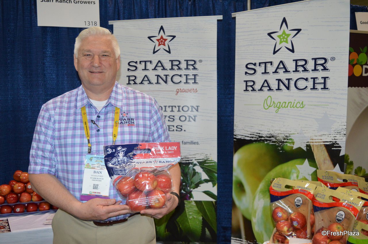 Dan Wohlford with Starr Ranch shows new branding on a pouch bag of Pink Lady apples. Starr Ranch did a company re-brand at the end of last year.