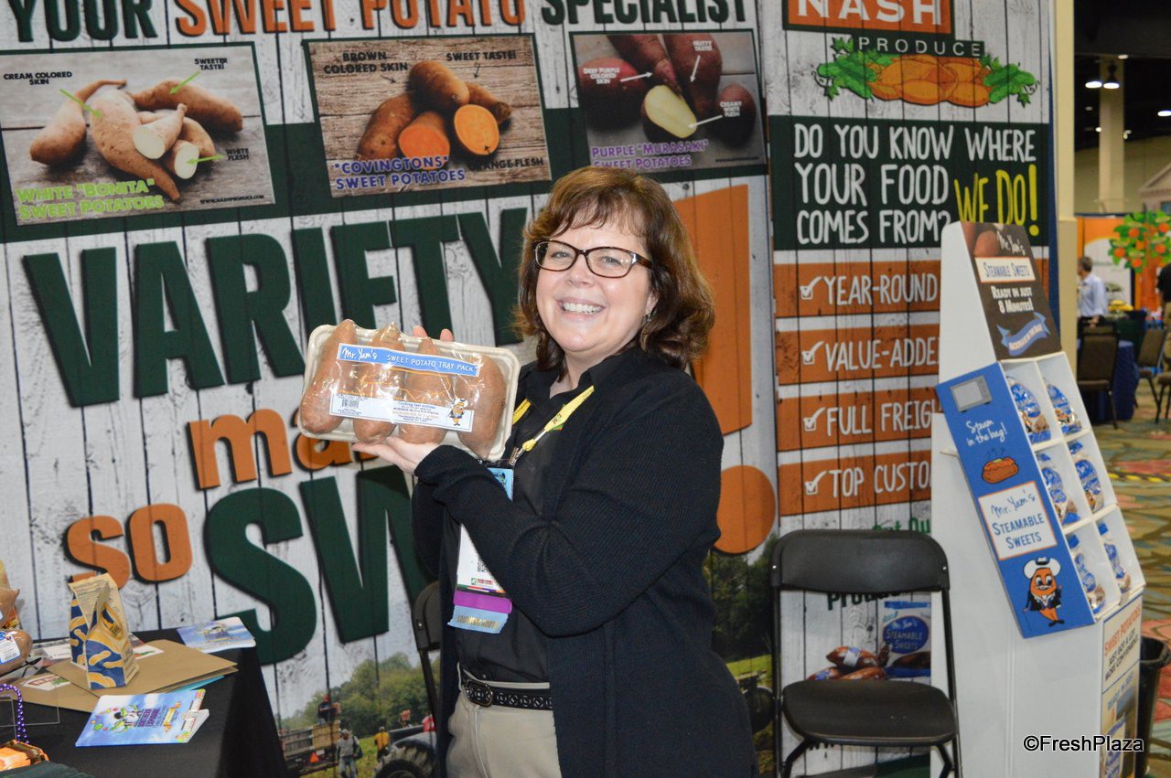 Tami Long with Nash Produce shows the company’s latest product: a Sweet Potato Tray Pack. The complete package can be put in the microwave. Potatoes are steamed and ready within about 10 minutes.