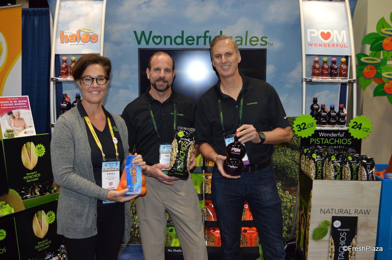 Erika Descoust, Brian Gadwah and Kurt Vetter with the Wonderful Company show the company’s main products: Halo mandarins, pistachios and POM’s pomegranate juice.