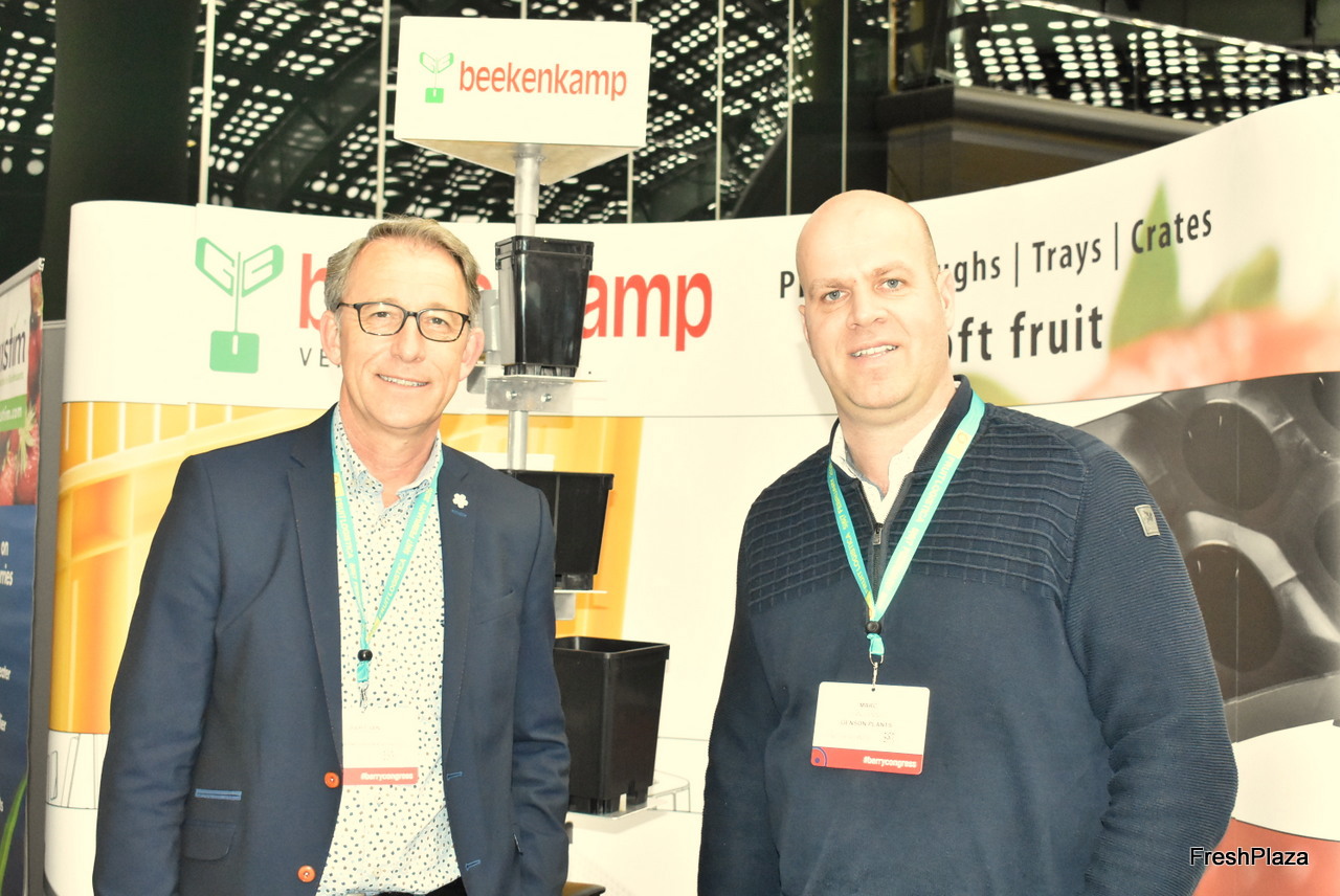 Aart Jan Bos from Beekenkamp and Marc van Gennip fromGenson Soft Fruit Plants, Aart had new tubs for growing blueberries, 35 and 45 litre with a special bottom for great stacking to cut logistical costs.