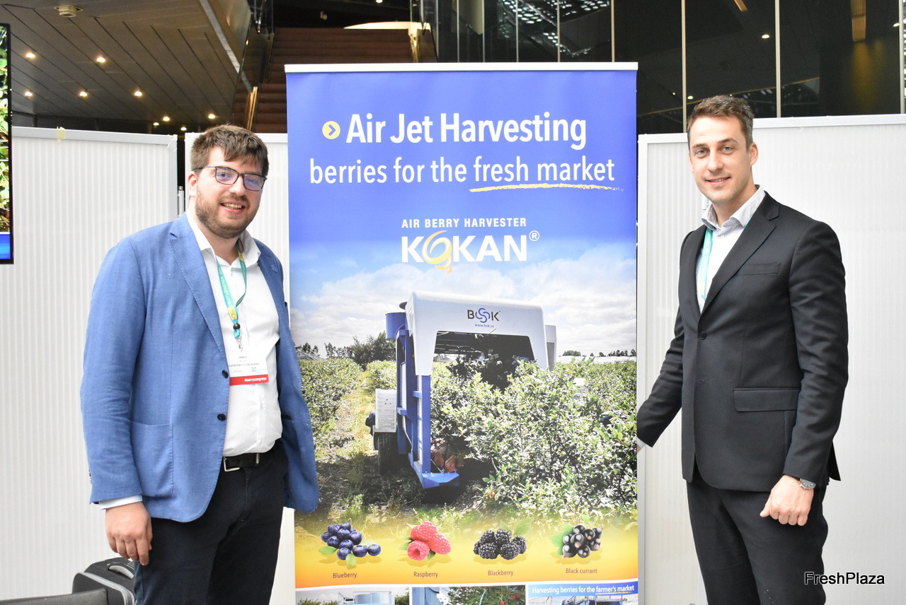 Janko Jevtic and Marko Kokanovic at the KOKAN stand. The company has produced a berry harvester which harvests the fruit using air jets.