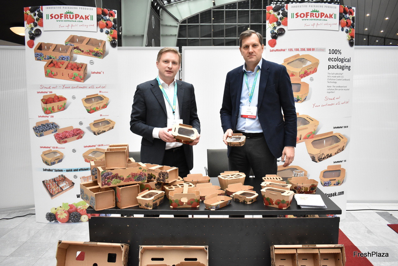 Adam Sikorski and Witold Gaj from SoFruPak with a range of totally recyclable cardboard packing.