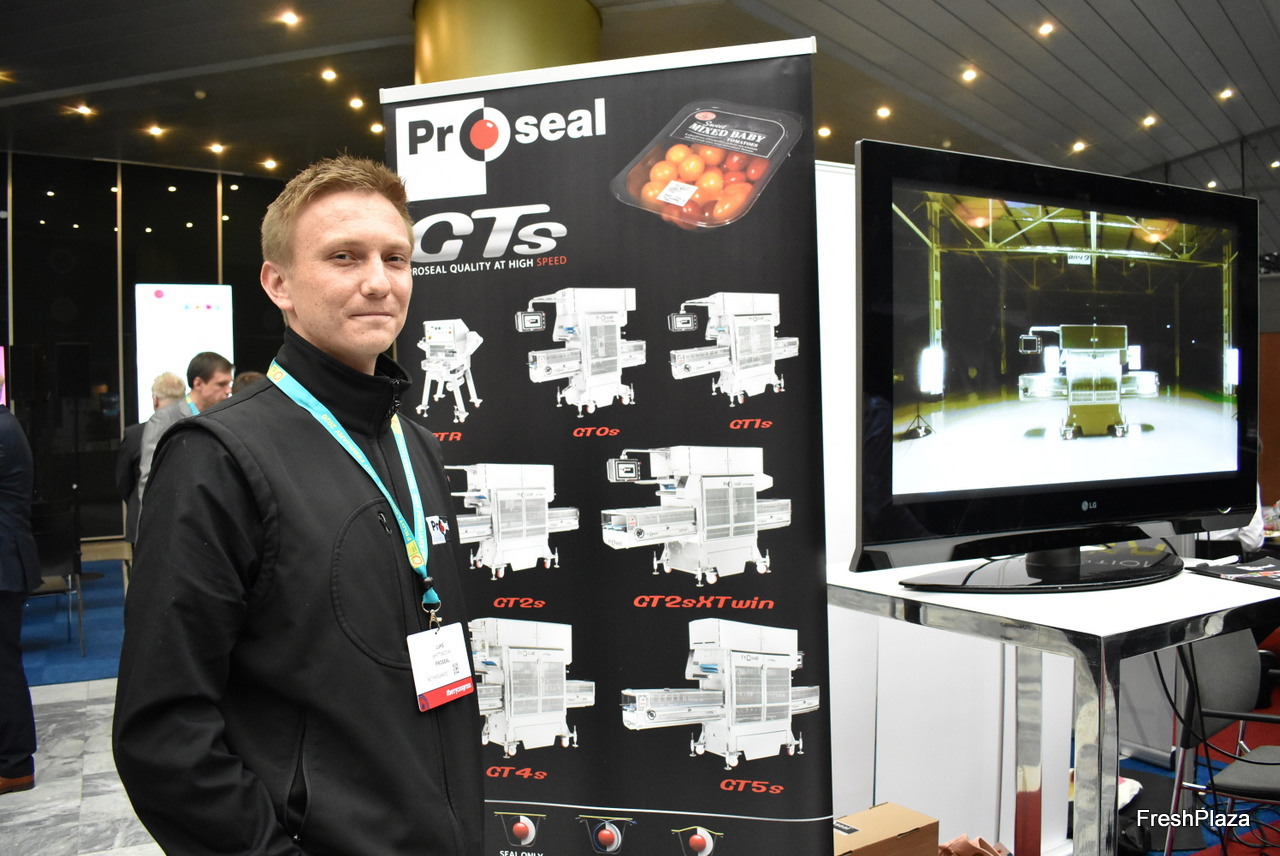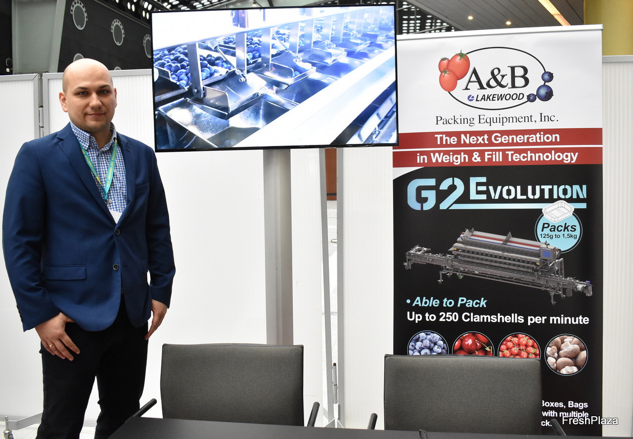 Piotr Milewski from A&B Packaging promoting a blueberry packing machine.